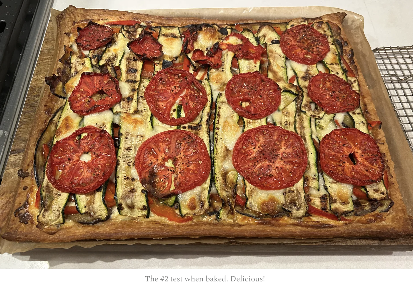 But the second version — with less mozzarella and thinner vegetables — I liked. What I really liked about this tart is that I made it with a puff pastry base. Yes, it’s more complicated, but the resulting tart was incredibly light and crisp. I served it at two dinner parties and it scored raves all around. Success!